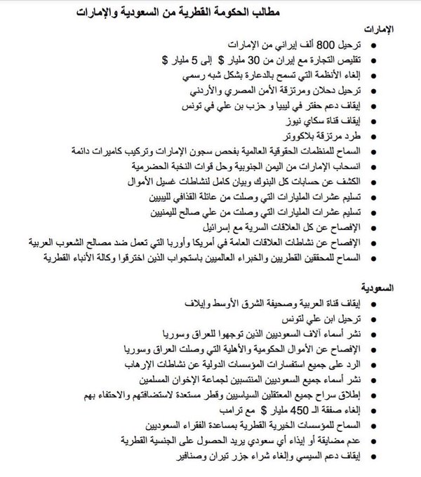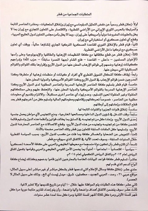 رد: قائمة مطالب ((دول الحصار)) لقطر